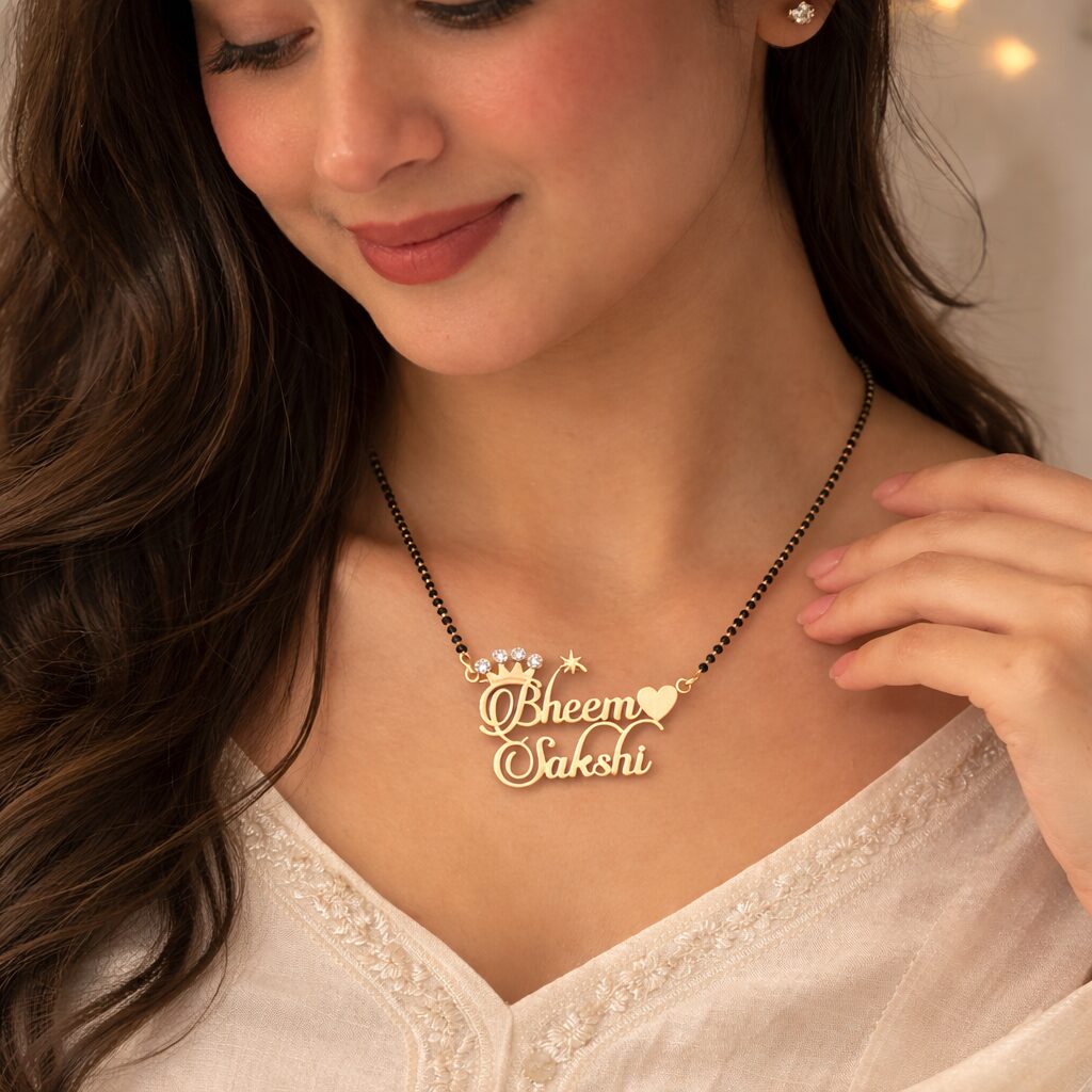 Personalized Couple Name Mangalsutra with Crown & Heart Pendant – 24k Gold Plated Custom Name Jewelry for Women – Unique Anniversary & Wedding Gift