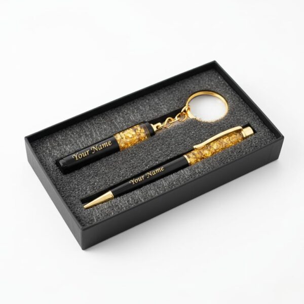 - Premium Golden Foil Design: The upper barrel of both the pen and the keychain is filled with stunning, high-quality golden foil flakes, creating a sophisticated and eye-catching look.