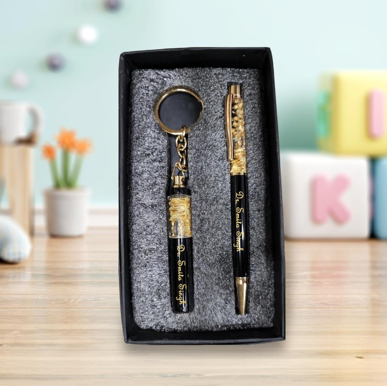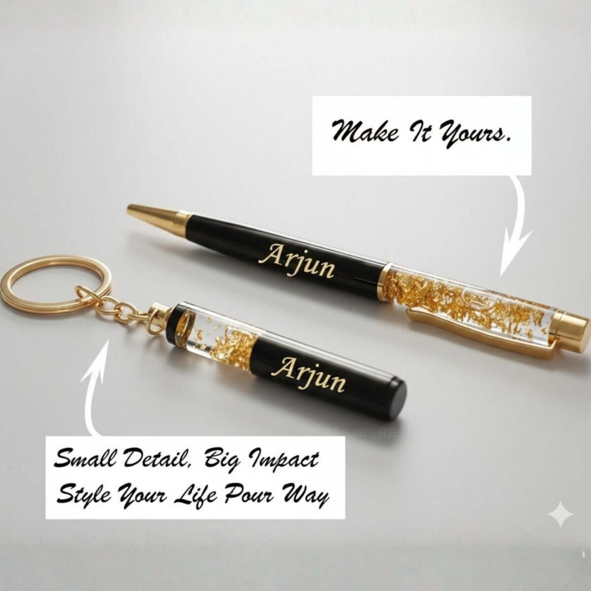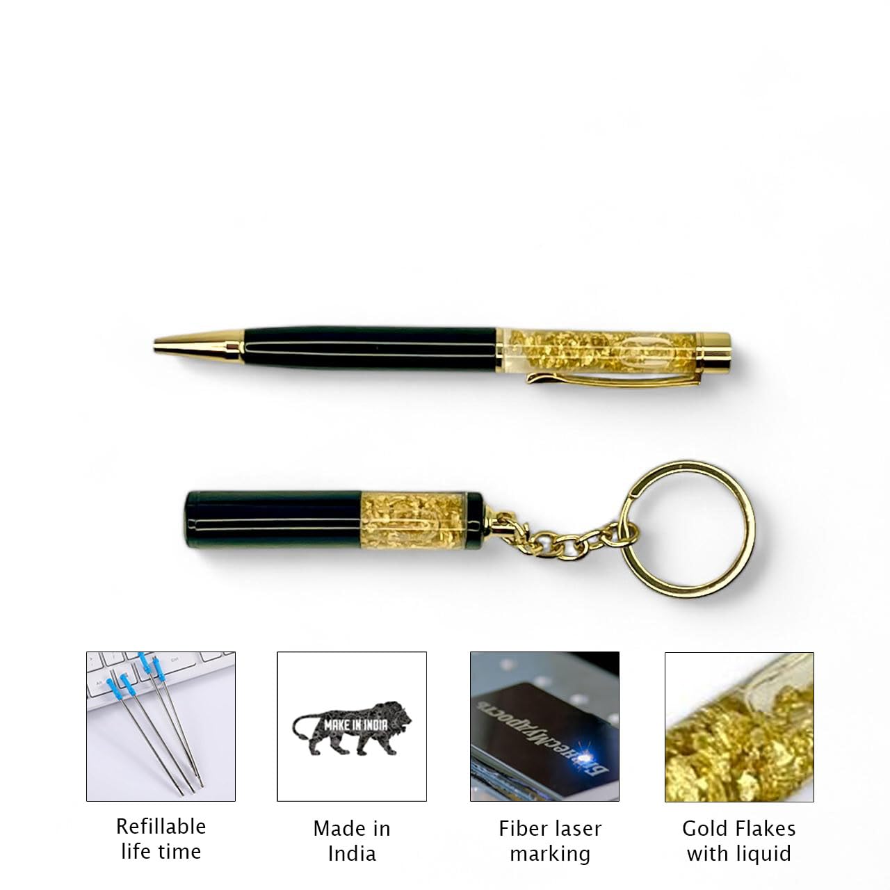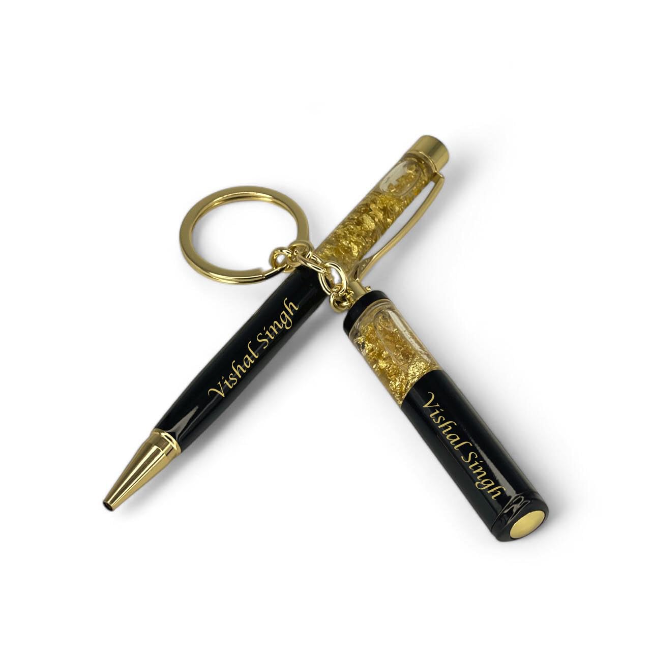 - Premium Golden Foil Design: The upper barrel of both the pen and the keychain is filled with stunning, high-quality golden foil flakes, creating a sophisticated and eye-catching look.